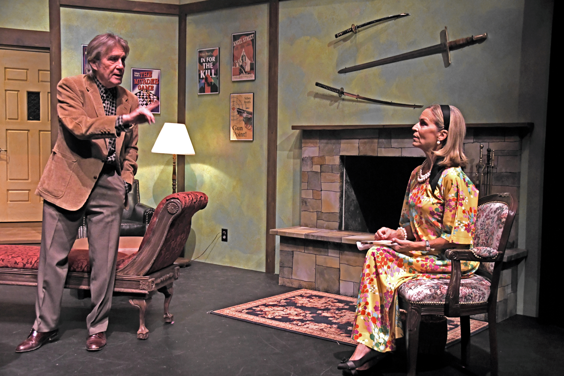 What I can describe for you is the impressive set designed by Michael Walker. The set will give you some infallible clues. All of the action takes place in a large room, Sidney’s elegant study where he writes his plays. We see a fireplace, French doors leading to a garden, and part of a flight of stairs. Covering the walls are daggers, swords, vintage pistols and even a crossbow.