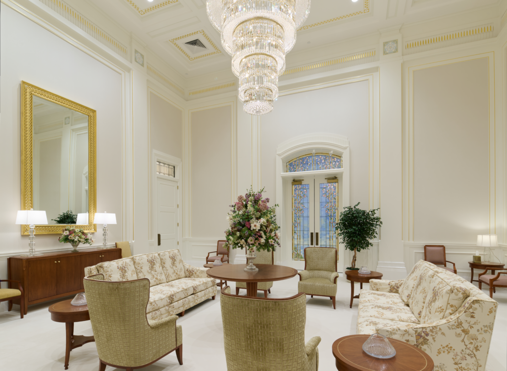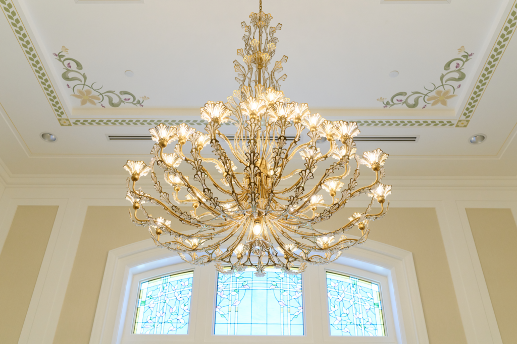Green vines, white and purple flowers, and delicate gold trim decorate the inside of the temple. Beige marble from Italy and stained cherry wood are used throughout the building. Crystal and brass chandeliers hang from the ceilings.