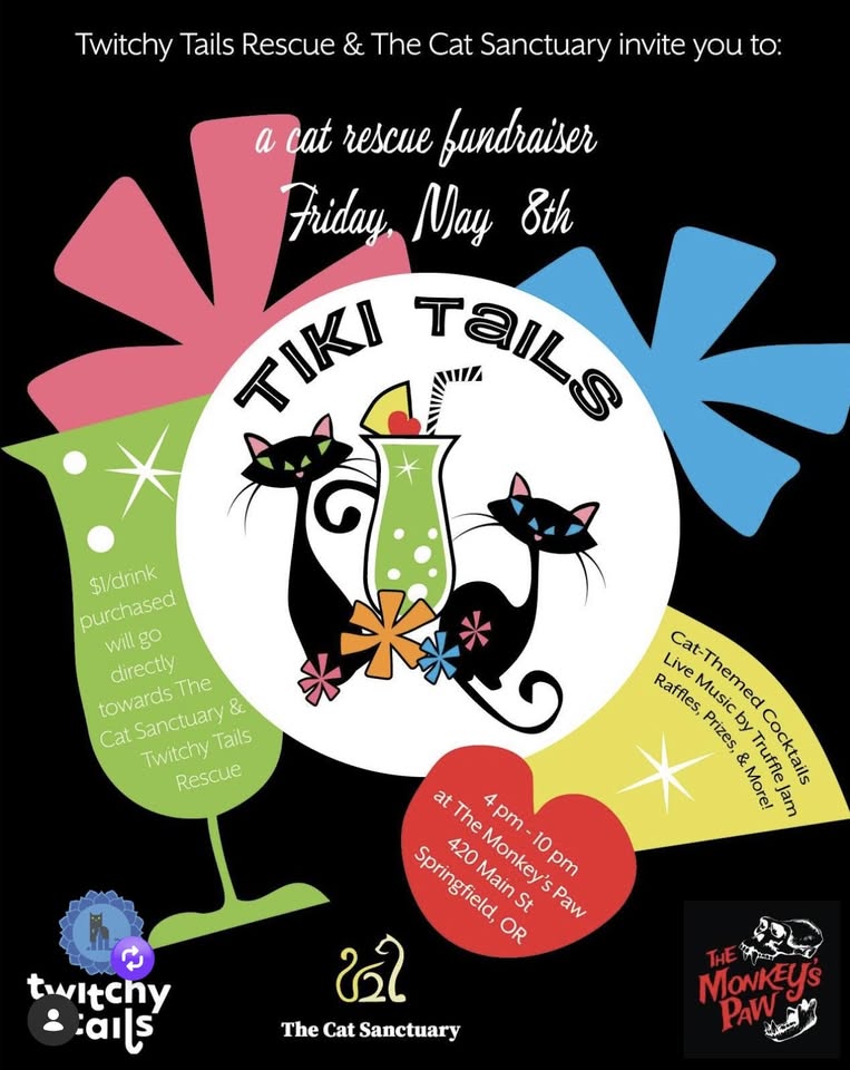 Join us from 4 to 10 pm at The Monkey’s Paw Tiki Bar, 420 Main St., Springfield, OR, for live music from Truffle Jam, awesome raffle prizes (you do not have to be present for the drawing), and to give back ($1 from each drink helps our rescue cats and kittens).
